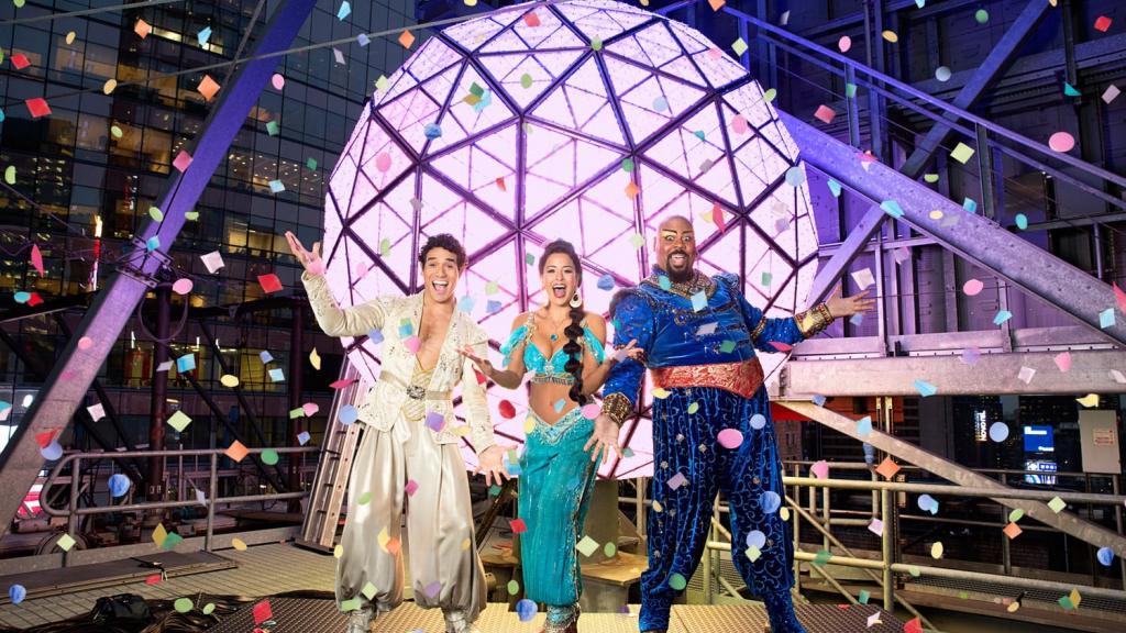 Live X programmed the Times Square Ball for this photo celebrating the announcement of Broadway's Aladdin as the Official Sponsor of the Times Square New Year’s Eve Confetti Wishes.