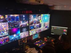 This studio installation consists of robotic cameras, teleprompter, audio mixer, computer and tv monitors, and two Production Bots for graphics and the ability to bring in any remote contributions for talent joining the stream from different locations around the world.