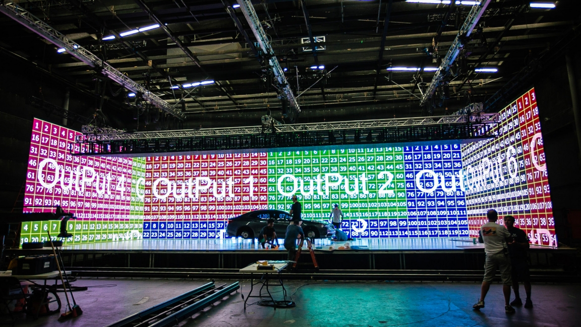 Our team also took advantage of the powerful pairing of TouchDesigner and Production Bot to implement 10 display outputs of 1920x1080p that simultaneously maneuvered the digital environments in sync with automated cameras to capture the encompassing dynamic sequences. This setup also allowed for in camera color correction - vastly reducing the time for post production and editing. The portable Production Bot also allowed content creators to set up for the next production day while off set.